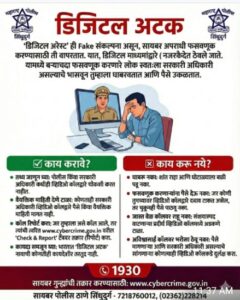 थोडक्यात ‘डिजिटल अरेस्ट है महाराष्ट्रापुदीत एक मोठे आव्हान आहे. यात पैसा तर जातीच, पण त्याहूनही जास्त नुकसान हे समाजाच्या आत्मविश्वासाचे आणि मानसिक स्वास्थ्याचे होते. एक पोलीस अधिकारी म्हणून, आपली भूमिका केवळ गुन्हेगार पकडण्यापुरती मर्यादित नाही, तर समाजाला या ‘डिजिटल विषा पासून वाचवण्याची आहे. अक्षात घ्या. “वास्तविक पोलीस कधीही तुम्हाला व्हिडिओ कॉलवर अटक करत नाहीत.