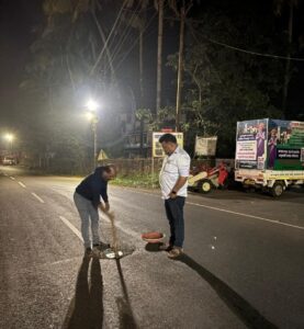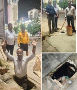 सावंतवाडी प्रतिनिधी: गेले कित्येक दिवस नगरपरिषद समोर फुटपाथ ज्या ठिकाणी ट्रॅफिक पोलीस थांबतात त्या ठिकाणी एक खूप मोठा खड्डा होता. त्या फुटपाथ वरून सकाळच्या सत्रामध्ये मॉर्निंगवॉक साठी ये – जा करणारे ज्येष्ठ नागरिकांची नेहमी रहदारी असायची काही वेळा त्या ठिकाणी तीन अपघात देखील झाले होते अशी पोलिसांनी माहिती दिली तर याचीच दखल घेऊन सुशील चौगुले सावंतवाडी तालुका शहर प्रमुख माहिती अधिकारी व पोलीस मित्र सुमित (आबा) पिरणकर, मयूर सावंत, मनोज गुंजाळ व सुनील नाईक यांनी सामाजिक बांधिलकीचे सदस्य रवी जाधव यांना विनंती केली असता काल रात्री एकच्या सुमारास तो खड्डा सिमेंट काँक्रेट ने बुजवण्यात आला तसेच तीन मुशीकडील हॉस्पिटलच्या मार्गावर असलेला मोठा खड्डा देखील बुजवण्यात आला.