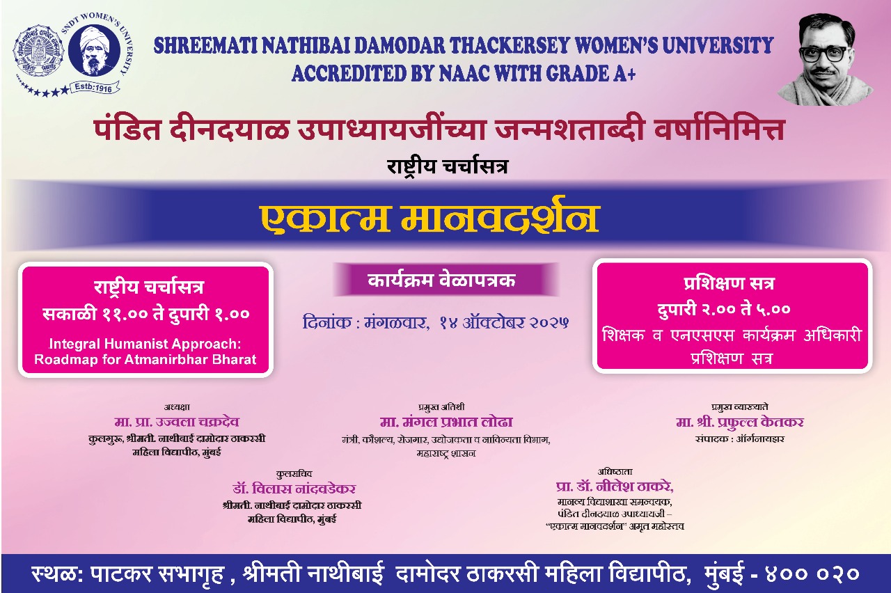 मुंबई: पंडित दीनदयाळ उपाध्याय यांच्या जन्मशताब्दी वर्षाचे औचित्य साधून, श्रीमती नाथीबाई दामोदर ठाकरसी महिला विद्यापीठात ‘एकात्म मानवदर्शन’ या महत्त्वाच्या विषयावर एक दिवसीय राष्ट्रीय चर्चासत्र आणि प्रशिक्षण सत्राचे आयोजन करण्यात आले आहे.
