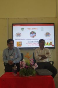 या कार्यक्रमासाठी श्री. अद्वैत पाटकर, फळ प्रक्रिया उद्योजक, लांजा (जि. रत्नागिरी) तसेच कोकण कृषी विद्यापीठ, दापोलीचे माजी विद्यार्थी, हे प्रमुख वक्ते म्हणून उपस्थित होते. त्यांनी बँकिंग क्षेत्र व इतर खासगी कंपन्यांमधील अनुभवाच्या आधारे आपला व्यवसाय यशस्वीरीत्या उभारला असल्याचे सांगितले. आपल्या व्यावसायिक प्रवासाचे प्रेरणादायी कथन करताना त्यांनी विविध क्षेत्रातील अनुभव उद्योजकतेस कसा हातभार लावतो हे विद्यार्थ्यांना पटवून दिले.