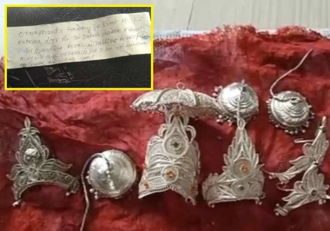 १७ मार्च वार्ता: ओडिशा येथील गोपीनाथपूर गावातील गोपीनाथ मंदिरात वर्ष २०१४ मध्ये चोरी झाली होती. देवाची चांदीची बासरी, छत्री, मुकुट, चांदीचे डोळे, ताट, घंटा चोरट्याने चोरून नेल्या होत्या. त्या वेळी ग्रामस्थांनी लिंगराज पोलीस ठाण्यात तक्रार दिली होती. त्यानंतर पोलिसांनी अन्वेषण चालू केले; मात्र गेल्या ९ वर्षांत याचा शोध लागला नाही. आता ९ वर्षांनंतर या चोरट्यानेच मंदिरातून चोरलेल्या सर्व वस्तू परत केल्या आहेत. स्वत:लाच त्याने शिक्षाही केली. त्याने १०१ रुपयांचा दंडही भरला, तर २०१ रुपयांची दक्षिणाही दिली आहे. त्याने एक चिठ्ठीही लिहिली आहे. त्यात त्याने देवाचे दागिने चोरल्यानंतर त्याला आलेल्या अडचणींची माहिती लिहिली आहे. यामुळेच देवाचे दागिने परत करण्याता निर्णय घेतल्याचे त्याने लिहिले आहे. या चोरट्याची ओळख अद्याप पटलेली नाही.